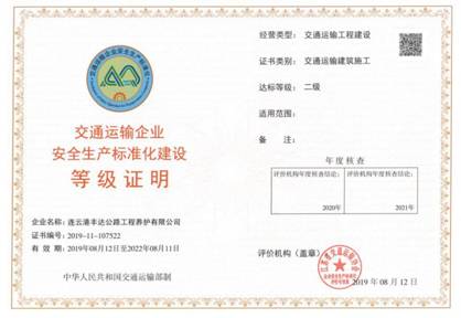 今年以來,豐達公司積極開展安全生產(chǎn)標準化達標創(chuàng)建工作,將安全生產(chǎn)標準化工作納入公司常態(tài)化管理,對照《交通運輸企業(yè)安全標準化》考核細則,先后修訂完善了安全管理制度7個,安全職責6個,各種規(guī)程3個,公司安全基礎設施建設和基礎管理逐步加強,生產(chǎn)作業(yè)現(xiàn)場管理日趨規(guī)范,安全生產(chǎn)管理水平穩(wěn)步提升。現(xiàn)已被江蘇省交通運輸協(xié)會認定為交通運輸企業(yè)安全生產(chǎn)標準化建設二級企業(yè)。