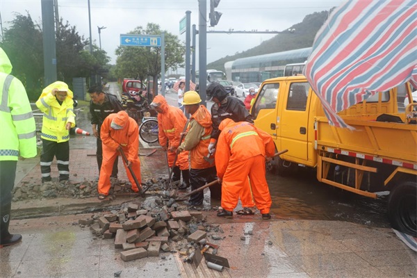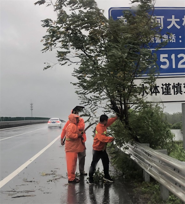 由于“煙花”臺風影響,公司管養(yǎng)道路發(fā)生多處路樹倒伏,橙色突擊隊應(yīng)急搶修人員發(fā)揮連續(xù)作戰(zhàn)精神,無懼風雨,連夜趕赴現(xiàn)場,迅速清理倒伏樹木,確保路面暢通。對于地勢低洼路段積水嚴重情況,養(yǎng)護應(yīng)急人員火速將抽水泵運到現(xiàn)場,開足馬力抽水排水,同時及時疏通排水溝、涵洞,搶抓時間及時修補路面坑塘,第一時間消除道路安全隱患,確保公司管養(yǎng)道路安全暢通。