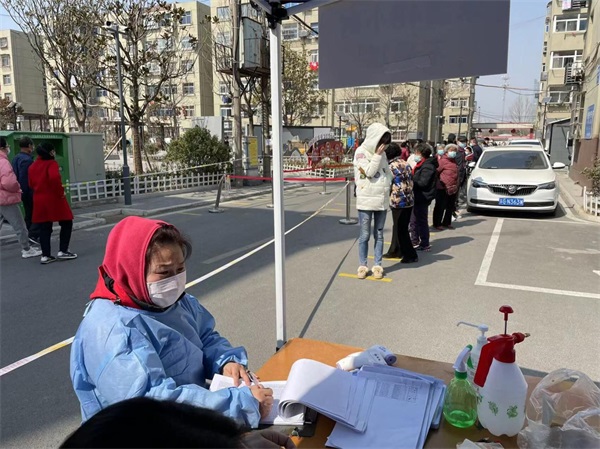 公司黨員胡平在隴園新村當志愿者,幫助登記核對核酸檢測居民信息。