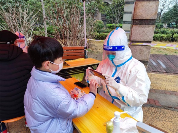 趙笑楠在孔望山社區(qū)為做核酸的人員查驗身份證