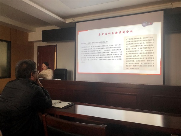公司法務(wù)專員盧長(zhǎng)敏以《大力弘揚(yáng)憲法精神,建設(shè)社會(huì)主義法治文化》為主題,介紹了國(guó)家憲法日的由來、確立、目的和意義,憲法是什么,我國(guó)憲法的基本精神和特征,新時(shí)代如何弘揚(yáng)憲法精神等,重點(diǎn)以齊玉苓受教育案、假冒基金公司網(wǎng)絡(luò)詐騙案等案例闡述了公民基本權(quán)利受到侵害時(shí)憲法救濟(jì)的重要性,讓大家進(jìn)一步了解憲法、遵守憲法、維護(hù)憲法。