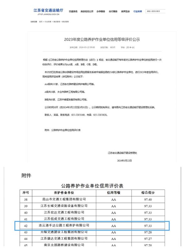 近日,經(jīng)省交通運輸廳2023年度公路養(yǎng)護作業(yè)單位信用等級評價,豐達公司成功榮獲公路養(yǎng)護作業(yè)單位信用評價AA等級。這是繼上周榮獲江蘇省2023年度施工信用評價AA級后,再次被評定為AA信用評級(首次),實現(xiàn)雙評級。