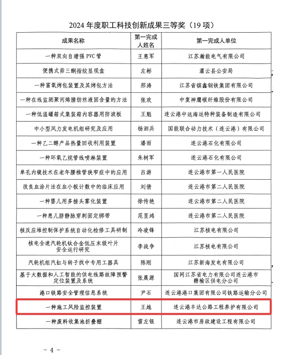 為全面落實(shí)習(xí)近平總書記關(guān)于科技創(chuàng)新的重要指示要求,連云港市總工會(huì)緊扣《新時(shí)代連云港產(chǎn)業(yè)工人隊(duì)伍建設(shè)改革實(shí)施方案》,在全市職工中征集科技創(chuàng)新成果和先進(jìn)操作法。經(jīng)個(gè)人申報(bào)、單位推薦、專家評(píng)審、媒體公示,認(rèn)定和表彰33項(xiàng)操作法為“2024年度連云港市職工科技創(chuàng)新成果。公司職工王越的“一種施工風(fēng)險(xiǎn)監(jiān)控裝置”獲市職工科技創(chuàng)新成果三等獎(jiǎng)。