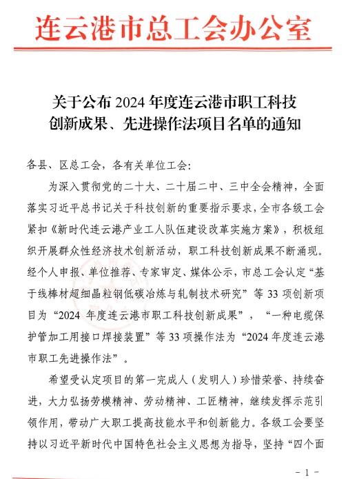 近日,在2024年度連云港市職工科技創(chuàng)新成果、先進(jìn)操作法作品評(píng)選中,豐達(dá)公司王越一項(xiàng)創(chuàng)新成果獲市職工科技創(chuàng)新成果三等獎(jiǎng)。
