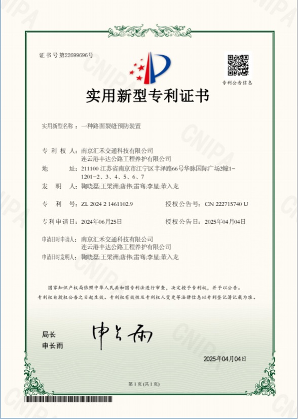 近日,豐達(dá)公司申報(bào)的實(shí)用新型專利《一種路面裂縫預(yù)防裝置》,經(jīng)國家知識(shí)產(chǎn)權(quán)局受理審核,成功獲得實(shí)用新型專利證書。