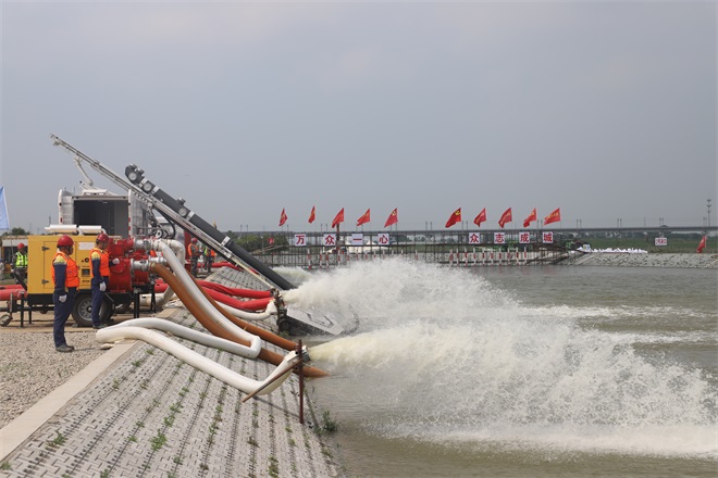 此次全市防汛搶險綜合演練設(shè)置臺風(fēng)、城市特大暴雨、堤防險情、人員落水四個搶險救援背景并按照預(yù)警響應(yīng)、隊伍集結(jié)、險情處置等環(huán)節(jié)有序開展,豐達公司主要演練科目為“城市特大暴雨——城市內(nèi)澇處置”,利用垂直供排水搶險車、及字母式大流量排水車進行機泵排澇。