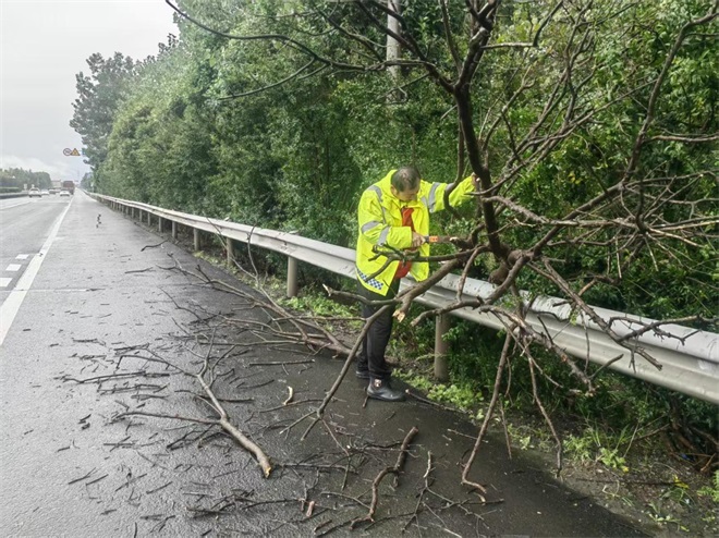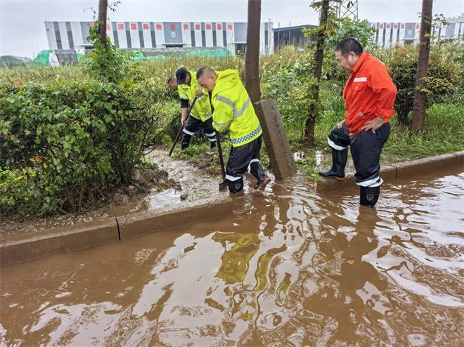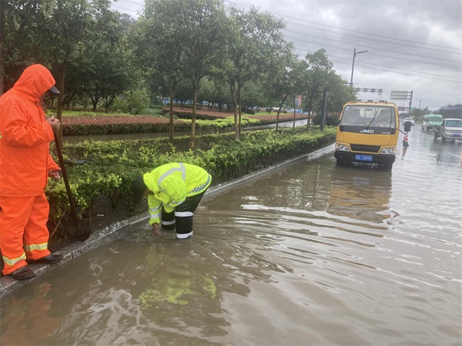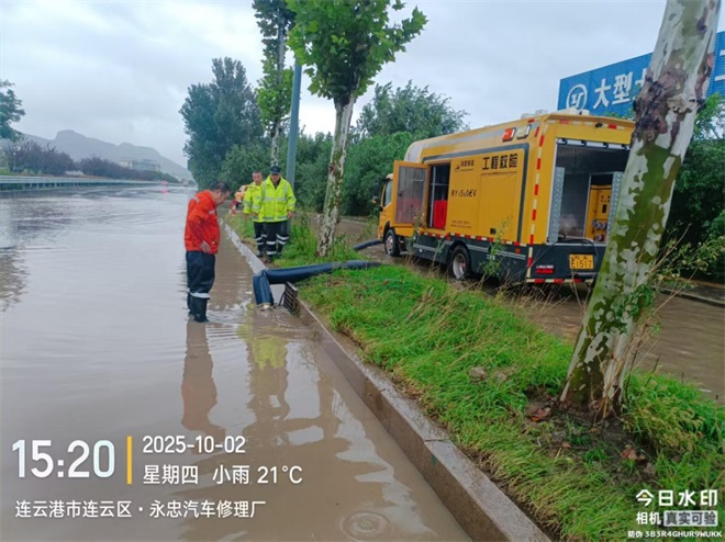 10月2日,大雨突降,公司迅速啟動(dòng)防汛應(yīng)急預(yù)案,嚴(yán)格落實(shí)防汛措施,不分晝夜,連續(xù)對(duì)所轄高速公路、國(guó)省干線等重點(diǎn)路段及沿線設(shè)施開(kāi)展隱患排查,確保道路安全暢通。針對(duì)G310港城大道、G228新光路等路段積水較多、路邊樹(shù)木倒伏等嚴(yán)重情況,公司立即組織橙色突擊隊(duì)員、道路養(yǎng)護(hù)人員及時(shí)清理疏通倒伏樹(shù)木、排水溝、雨水井,全力保障排水系統(tǒng)暢通與道路安全,累計(jì)出動(dòng)道路養(yǎng)護(hù)人員 90人次、巡查車(chē)輛 12臺(tái)次,調(diào)配各類(lèi)機(jī)械設(shè)備 14 臺(tái)次,清理倒伏樹(shù)木20余株。連云港綜合客運(yùn)樞紐出站口突發(fā)雨水倒灌,公司立即組織應(yīng)急人員協(xié)助連云港站前廣場(chǎng)管理服務(wù)聯(lián)盟調(diào)動(dòng)水泵排水并引導(dǎo)旅客安全出行。經(jīng)50分鐘緊急處置,積水全部排除,道路恢復(fù)暢通。