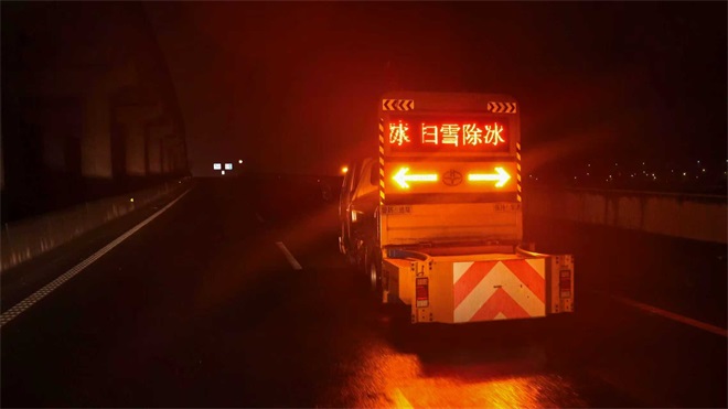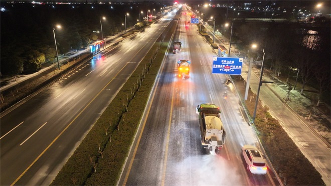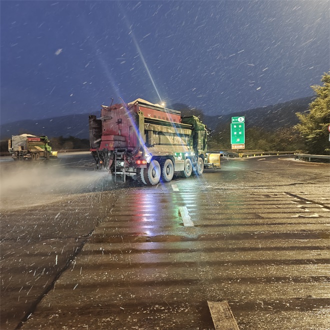 針對(duì)此次降雪可能引發(fā)的道路積雪、結(jié)冰隱患,豐達(dá)公司堅(jiān)持“預(yù)”字為先、“防”字為要,集結(jié)“橙色突擊隊(duì)”,開展全天候動(dòng)態(tài)巡查,確保以“快、準(zhǔn)、實(shí)”的舉措把安全隱患消除在萌芽狀態(tài)。降雪伊始,公司領(lǐng)導(dǎo)率先垂范,帶領(lǐng)全體人員奮戰(zhàn)一線,各工區(qū)點(diǎn)位人員全員在崗在位。寒風(fēng)裹挾著雪花肆虐,夜色籠罩下的道路逐漸覆冰,“橙衣戰(zhàn)士”毫無(wú)退縮,他們頂風(fēng)冒雪奔赴一線,掃雪車開道清障,撒布機(jī)均勻拋灑融雪劑,人工組跟進(jìn)清理路邊殘雪。燈火映照下,“橙衣戰(zhàn)士”與機(jī)械并肩作戰(zhàn),勾勒出寒夜中最動(dòng)人的“破冰”畫卷。