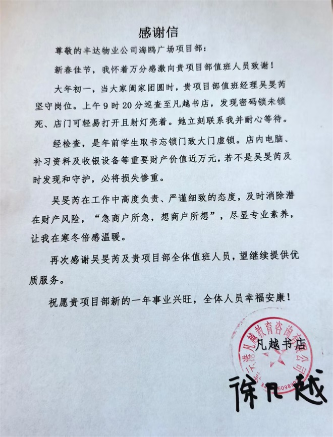 項(xiàng)目部值班經(jīng)理吳旻芮按照春節(jié)安全巡查要求,對(duì)廣場(chǎng)區(qū)域開展例行巡檢。行至凡越書店門口時(shí),她敏銳發(fā)現(xiàn)該門店密碼鎖未完全鎖死,店門可輕易推開。經(jīng)現(xiàn)場(chǎng)查看,店內(nèi)空無一人,射燈仍處于開啟狀態(tài),店內(nèi)存放有電腦、收銀設(shè)備及各類學(xué)習(xí)資料,一旦發(fā)生意外,商戶將面臨較大財(cái)產(chǎn)損失。發(fā)現(xiàn)隱患后,吳旻芮第一時(shí)間聯(lián)系書店負(fù)責(zé)人,說明現(xiàn)場(chǎng)情況,并主動(dòng)留在現(xiàn)場(chǎng)值守看護(hù)。約 15 分鐘后,書店負(fù)責(zé)人趕到現(xiàn)場(chǎng)。經(jīng)核實(shí),因節(jié)前學(xué)生取書后疏忽大意,導(dǎo)致店門虛鎖未關(guān)??吹轿飿I(yè)人員全程堅(jiān)守、認(rèn)真負(fù)責(zé),書店負(fù)責(zé)人連連致謝,對(duì)豐達(dá)物業(yè)公司的專業(yè)服務(wù)和責(zé)任擔(dān)當(dāng)贊不絕口。